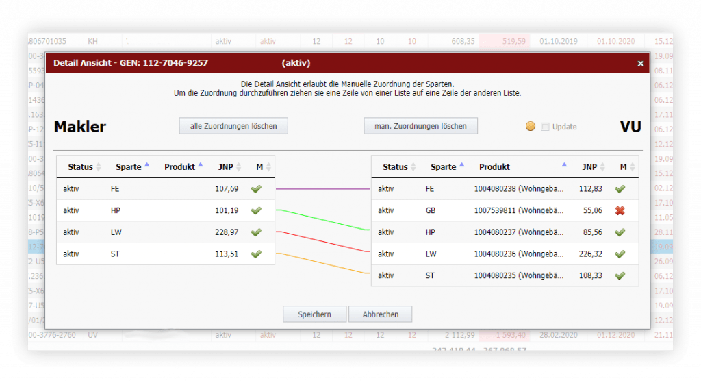 Abweichungen zwischen Versichererdaten und Kundendaten werden angezeigt. Zusätzlich werden innerhalb der vom Kunden definierten Regeln automatische Bestandsupdates ausgeführt, soweit sie von der Kundenverwaltung unterstützt werden. Größere, nicht nachvollziehbare Änderungen bedürfen der manuellen Bestätigung.