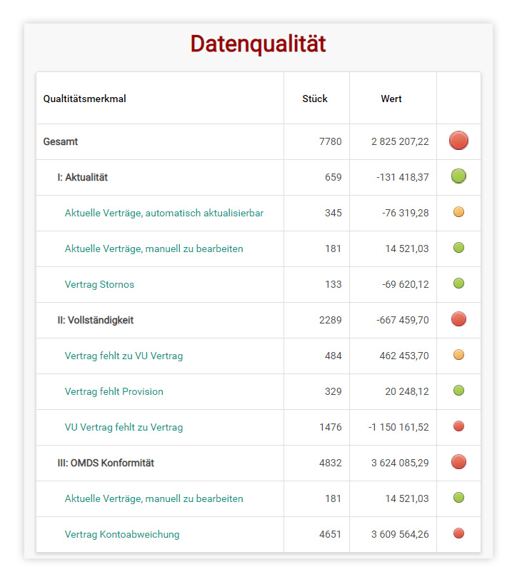 In dieser Leistungsstufe sind zahlreiche Listen zur Verbesserung der Datenqualität im Maklersystem enthalten, wie zum Beispiel: Abgleich von Unterschieden im Vertrag (Prämie, Spartenzuordnung), Vertragsstatus-Abgleich (aktiv, storniert), Abgleich der Zuordnung eines Vertrags zum Vermittlerkonto, Abgleich der Zuordnung von Provisionen zu Provisionskonten und Prüfung, ob ein Vertrag zu einem VU-Vertrag vorhanden und zuordenbar ist.
