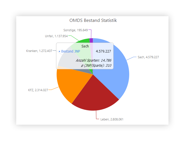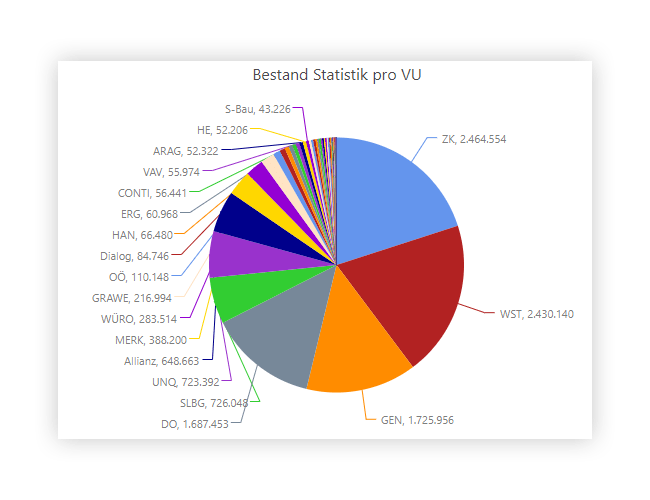 Unsere Darstellung enthält wichtige Basisinformationen wie Datenstatus und Jahresnettoprämie nach Sparte und nach Versicherungsunternehmen. Wir erstellen für Ihr Unternehmen grundlegende Statistiken wie die historische Bestandsentwicklung, den Bestandszuwachs und die Bestandsveränderung, Kennzahlen für die Bonifikation und die Darstellung der Jahresnettoprämie und Provision nach Kunde.