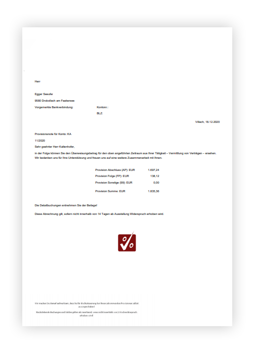 | Vermittlerprovision Abrechnung | EUR 15,60 pro Vermittlerkonto | ||